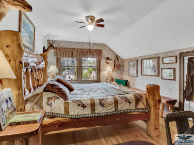 The King Cedar room features one of a kind cedar furniture on a Paul Bunyan scale. The motif is that of cowboys in years gone by. You may even hear the clip clop of horses in historic downtown. The king-sized bed offers you a good nights rest. The room has a private shower, wireless internet. Come downstairs and watch a movie, swing in the hammock between the blue spruce trees in the back, walk to a fine restaurant or bar, play a game of Scrabble or enjoy a cool drink on the back deck. Life in Cody is laid back and easy.