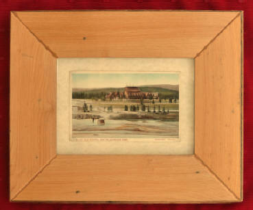 This image is available in various sizes, alone, matted, or framed in wood from the historic Old Faithful Inn floor which was taken up by Bob Berry, Jr in October 2004 during the first phase of the renovation. Please call for details. The Old Faithful Inn under construction in an Old Faithful Inn lobby wood frame is the best gift you can give to a "Yellowstoner."